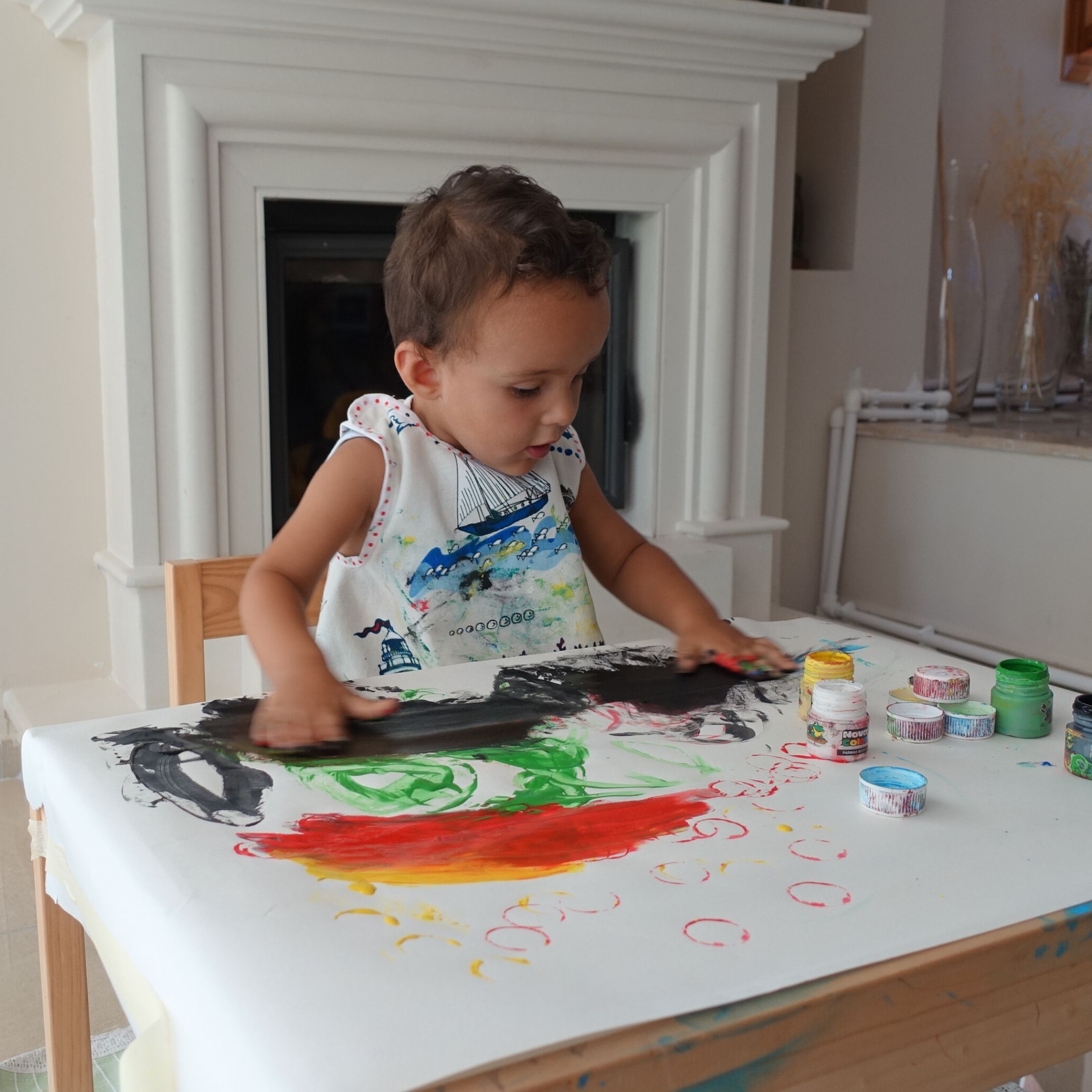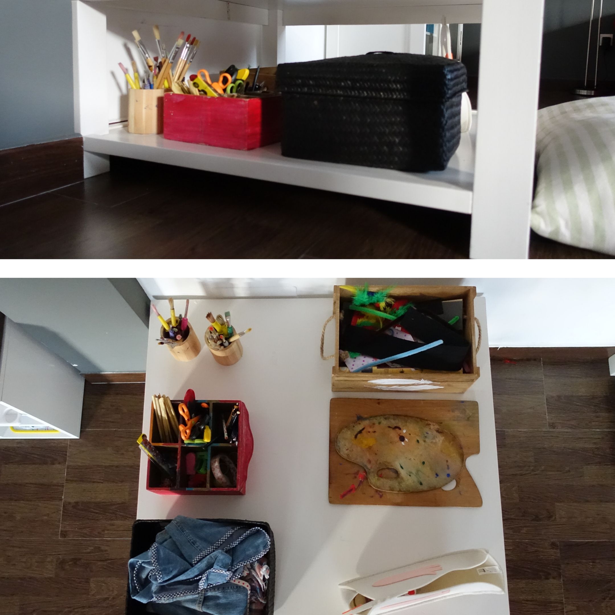 Suddenly there were a group of the same category items that go together, not only for the sake of order but also once you paint with a little kid, you need to set up space with table cloth and aprons than while painting you need wet wipes and once finished you need to clean and order it as quick as possible.
